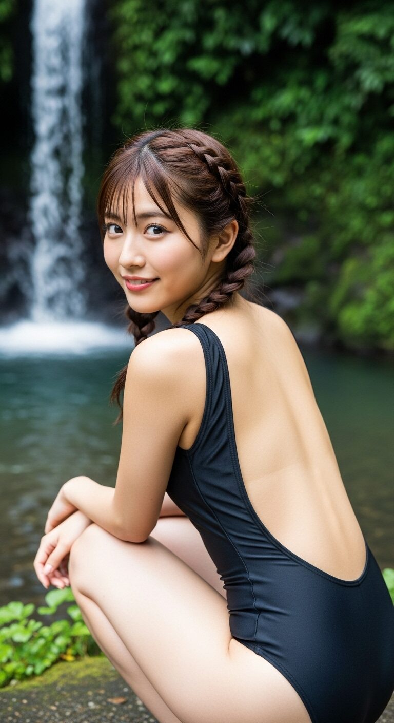 陽光が木々の葉を透かし、緑色の光が滝壺の水面に揺らめく。水しぶきが舞い上がり、幻想的な雰囲気の中で、藤村兎夢はいたずらっぽく微笑みながら、こちらを向いて屈んでいた。背中が大きく開いたバックレスのワンピース水着は、濡れた肌に張り付き、その滑らかな曲線を際立たせる。編み込みヘアからこぼれた数本の髪が、彼女の頬にかかり、その仕草はまるで森の妖精のようだった。「もう少し、こっちに来てくださいよぉ」と兎夢は、小悪魔のような微笑みを浮かべてカメラマンを挑発する。その瞳の奥には、底知れぬ魅力が潜んでいるようだった。「今日は、どんな表情を見せてくれるんですか?」と尋ねると、「楽しみにしててください。色んな私、見せてあげますよ」と兎夢はウィンクをした。緑と水に囲まれたこの空間で、彼女はますます輝きを増していく。