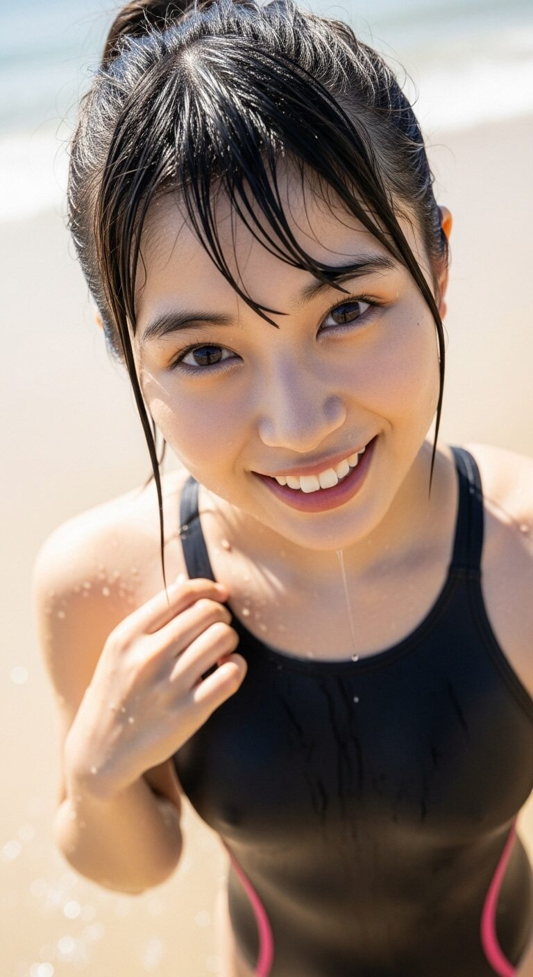 太陽が燦々と降り注ぐ真夏のビーチ。波の音と戯れるように、濡れた競泳水着が彼女の肢体にぴったりと張り付いていた。肩紐に軽く指をかけ、こちらに満面の笑みを向ける姿は、まるで人魚姫のよう。ぬけがらのようだった僕の心は、一瞬で彼女の虜になった。碧く澄んだ瞳と、ポニーテールが揺れるたびにきらめく水滴。まさに、夏の女神が舞い降りた瞬間だった。