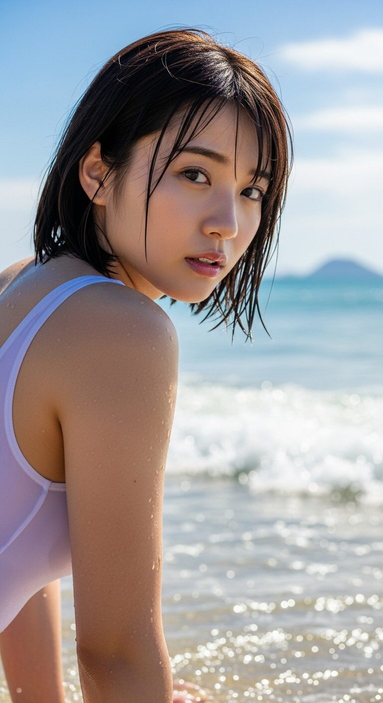 真夏の太陽が照りつける中、波の音だけが響く静かなビーチ。蒼く広がる海をじっと見つめる少女がいた。名前は根津つかさ。透け感のあるワンピース水着から覗く健康的な肌が、太陽の光に照らされて輝いている。ショートカットの髪を揺らしながら、時折真剣な表情で水面を見つめるその姿は、まるで海の精霊のようだった。一体何を考えているのだろう。思わず僕はシャッターを切り続けた。
