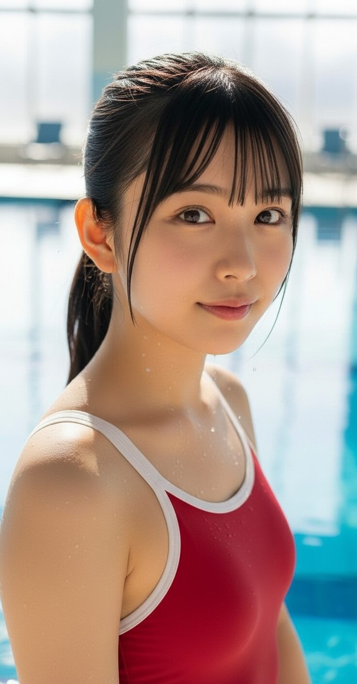 陽光が燦々と降り注ぐ、明るい室内プールサイド。水面のきらめきが壁に反射し、幻想的な空間を作り出している。そこで、赤色のスクール水着を身に纏った八重樫陽子が、無邪気な笑顔でこちらを見つめていた。細い白色の肩紐が華奢な肩を強調し、可愛らしいポニーテールが揺れる。少し照れたような、それでいてこちらを誘うような視線に、思わずドキッとしてしまう。