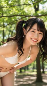 蝉の声が夏の終わりを告げているプールサイド。陽光にきらめく水滴をまとった八雲和花は、いたずらっぽく微笑みながらこちらを見つめていた。深いハイレグカットの水着が、彼女の華奢な身体をより一層際立たせる。スレンダーで可愛らしい、18歳。水も滴るいい女、とはまさにこのことだ。シャワーから降り注ぐ水が、彼女の滑らかな肌をさらに輝かせている。僕は思わずシャッターを切った。