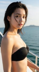 「そうだろう?君にはこの水着がぴったりだと思ったんだ」僕はファインダー越しに彼女の表情を追う。「もう少しだけ、今のポーズをキープしてくれるかな?」